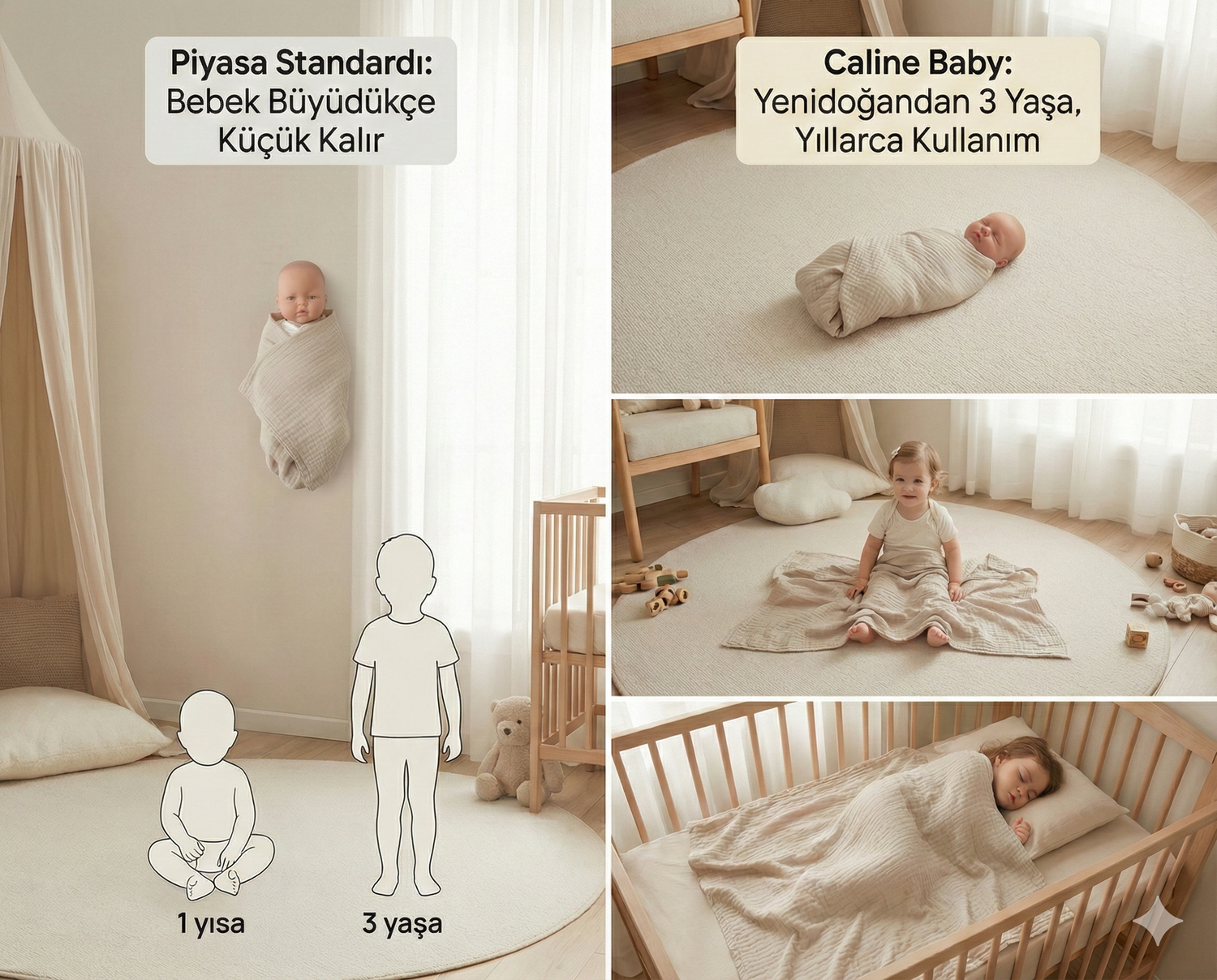 Caline Baby'nin büyük boyutları ise farklı bir hikaye anlatıyor. Yenidoğanda rahatça kundaklıyorsunuz. 1 yaşında hâlâ sarıyor. 3 yaşında bile yatağa yeterli geliyor. 5 yaşında bile konforlu bir örtü olarak sarılmaya devam ediyorlar.