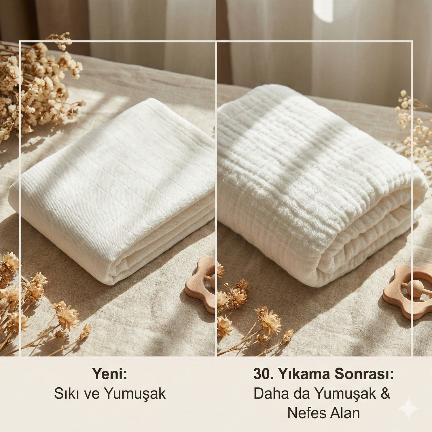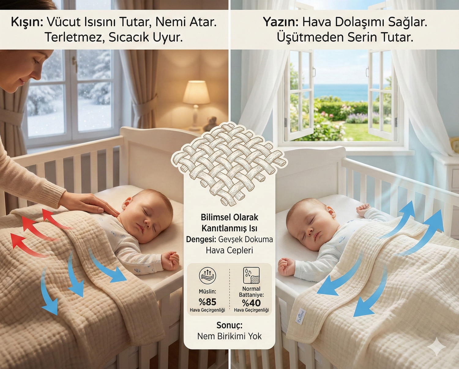 Bilim de bunu destekliyor: Müslin %85 hava geçirgenliğine sahip (normal battaniye %40). Bu da nem birikimi olmadan sıcaklık dengesi demek.