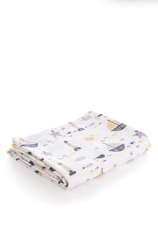 Müslin Bezi Gemi Desen Sarı 75x90 cm + 2 Adet Ağız Mendili