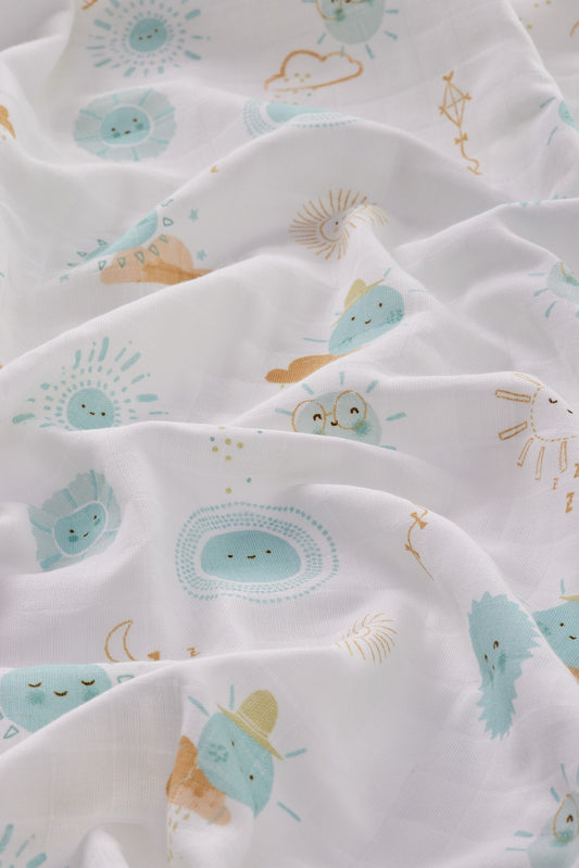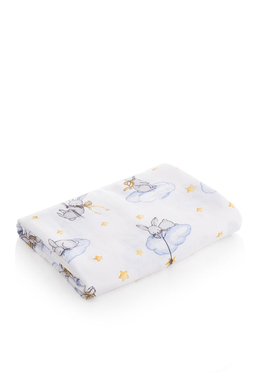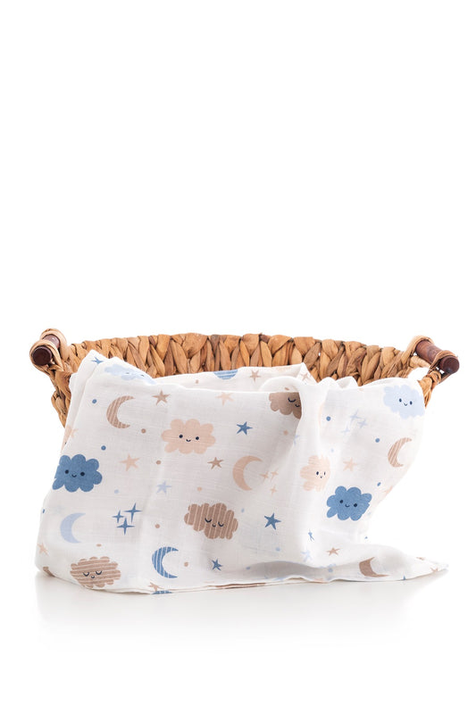 Müslin Bezi Örtü Bulut Desen Mavi 120x120 cm + 4 Adet Ağız Mendili