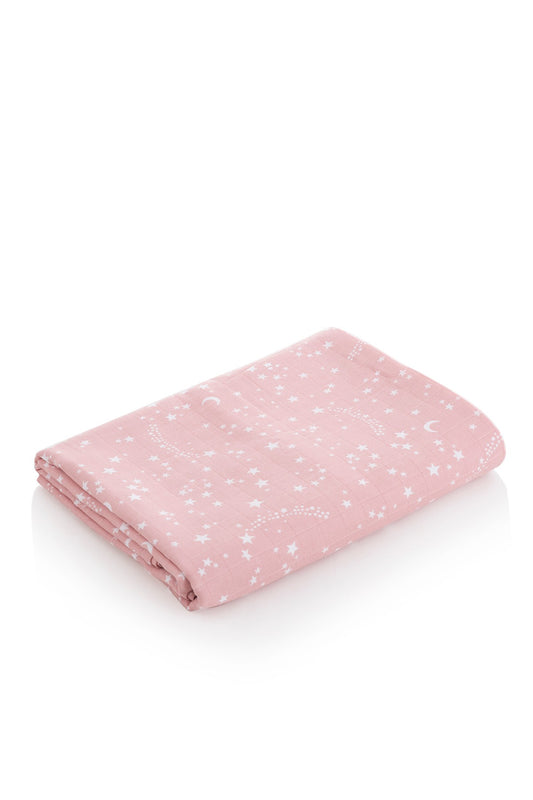 Müslin Bezi Örtü Yıldız Desen - Pembe 120x120 cm + 4 Adet Ağız Mendili