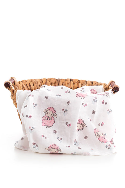 Müslin Bezi Örtü Kuzu Desen Pembe 75x90 cm + 2 Adet Ağız Mendili